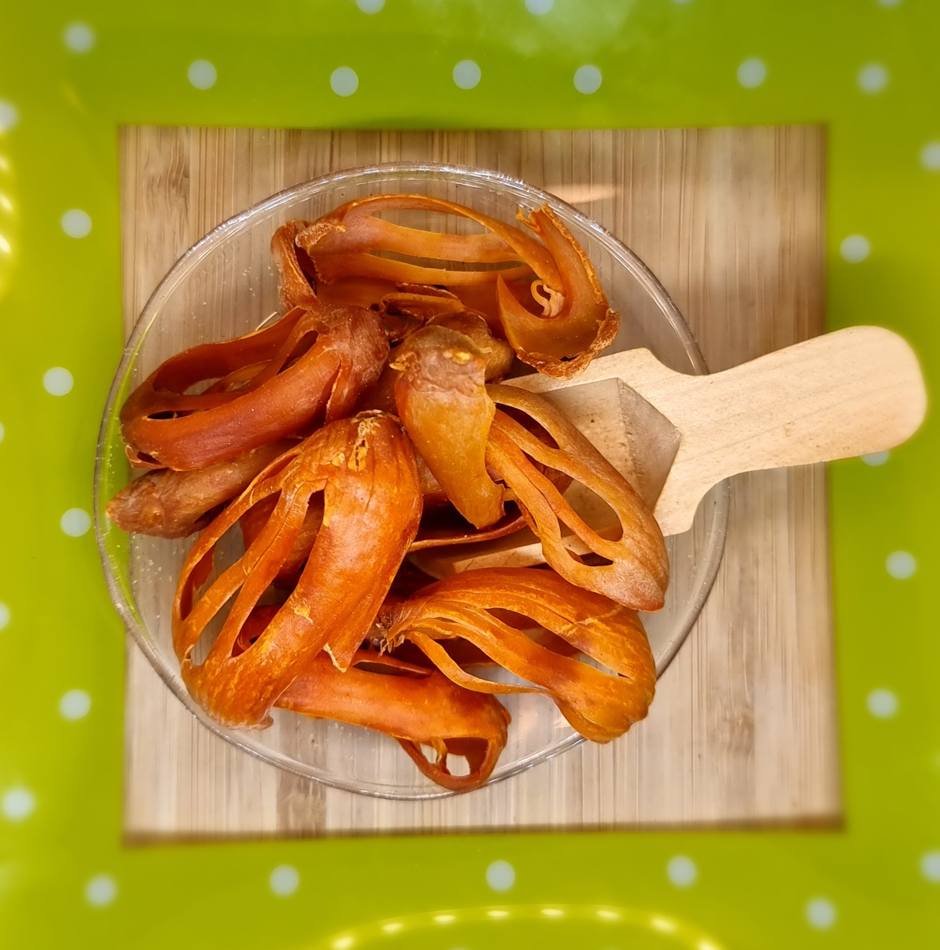 Foelieblad heel Kwaliteit komt van het omhulsel van de nootmuskaatnoot. Dankzij de verfijnde smaak komt foelie bij zowel hartige als zoete gerechten tot zijn recht. Foelie kan worden meegekookt, zodat het langzaam zijn smaak vrijgeeft. De specerij kan ook vers gemalen verwerkt worden in gerechten en baksels. Ook kan er koffie mee op smaak gebracht worden. In Frankrijk is het juist weer erg populair bij visgerechten. Foelieblad wordt in soepen,stoofgerechten rundvlees,kip,vis en speculaaskruiden.De zaadmantel van de muskaatnoot is niet volledig gesloten maar bestaat uit onregelmatig gevormde sliertjes, rondom het zaad. Dit is de foelie. De productie ervan is dus onlosmakelijk verbonden met die van nootmuskaat. Bij de oogst is de foelie karmozijnrood, maar na het drogen is de kleur oranjeachtig. Foelie uit Grenada droogt oranjegeel op. Tijdens het drogen wordt het met zout water besproeid. Een volledig stuk foelie is ongeveer drie centimeter lang en een millimeter dik.